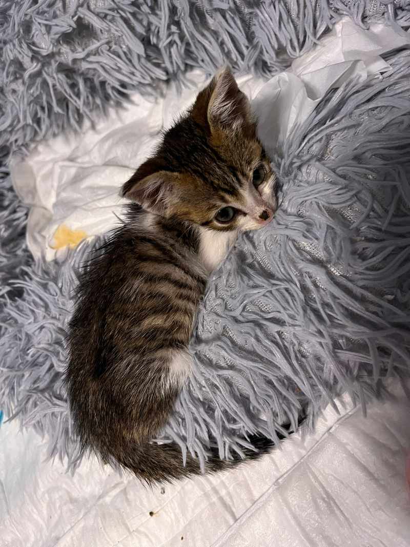 Bolek, unser kleiner Kämpfer, wurde ebenfalls dort abgegeben. Mit geschätzten acht Wochen bringt er gerade einmal 450 Gramm auf die Waage. Viel zu wenig – aber was ihm an Gewicht fehlt, macht er mit einem Schnurrmotor der Extraklasse wieder wett. Doch wir wissen: Die kommende Pflegezeit wird nicht leicht!